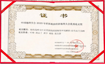 2019级人文地理学博士研究生叶帅的论文《地缘战略交汇区类属的国别地缘环境解析-以乌克兰为例》获得优秀论文奖,表明我校人文地理学在人才培养、科研创新、学术交流等方面已进入国内高水平学术圈。