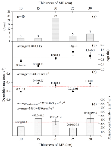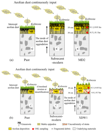 研究团队通过野外调查,在青藏高原东北部选取45个典型高寒草甸土剖面进行系统研究,采用光释光测年的石英单片再生剂量法测定54个草毡表层光释光样品的年代,结果表明:现生草毡表层形成主要发育自晚全新世约3000年以来,集中于1400-200年,其中多数厚约20 cm的草毡表层形成平均需要900年。草毡表层元素地球化学组成、粒度等理化特征和现代大气降尘的对比分析表明,大气降尘对草毡表层的形成具有重要贡献,草毡表层平均形成速率为每年0.3 ± 0.04 mm,降尘贡献率为每平方米每年346.3 ± 45.9 g,该结果与近几年现代大气降尘观测通量基本一致。基于各土壤层不同层位年代学分析和土壤理化分析,提出高寒草甸土发育模式有风尘连续加积发育和间断加积发育两种类型。