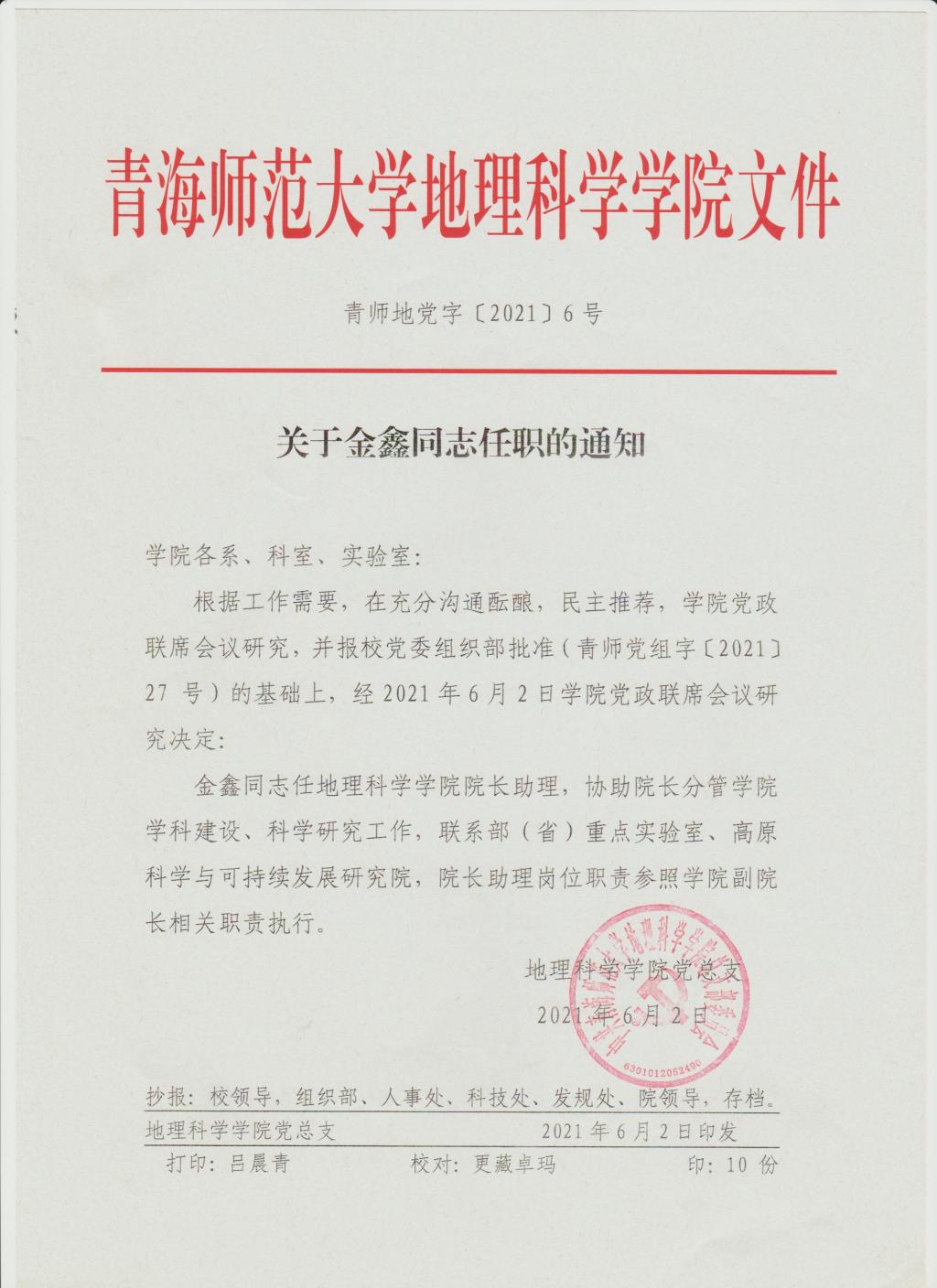 关于金鑫同志任职的通知