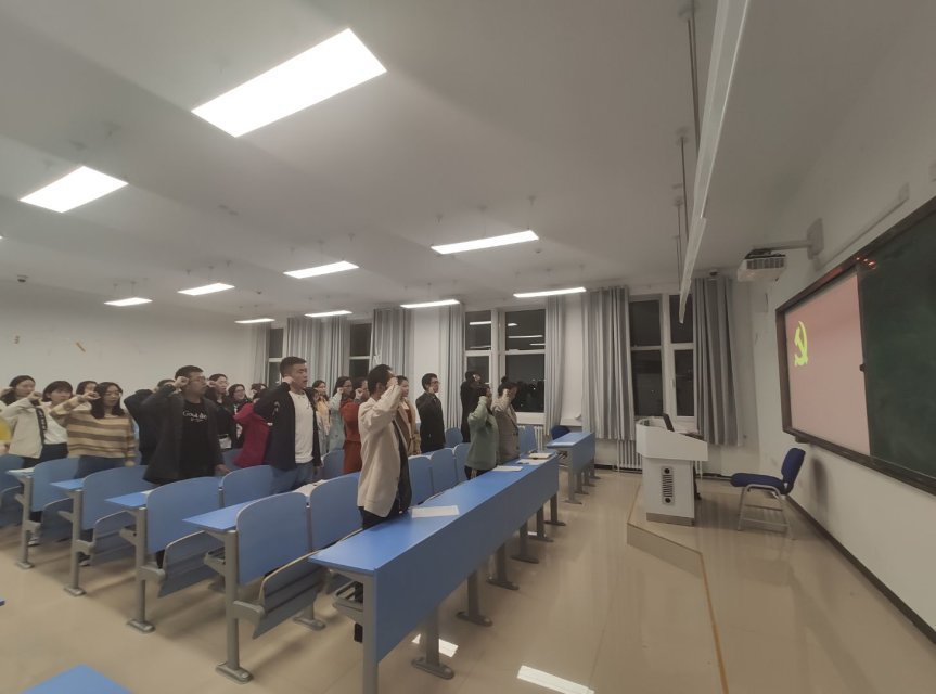 活动开始前大家合唱国际歌,之后由吕晨青向参会党员和积极分子致词,希望同学们不骄不躁,锐意进取,继续发扬优点,纠正缺点,增强党员意识,对自己作为党员这个身份负责,对“党员”这个称号负责,最后大家重温入党誓词一起庄严宣誓“永不叛党”。